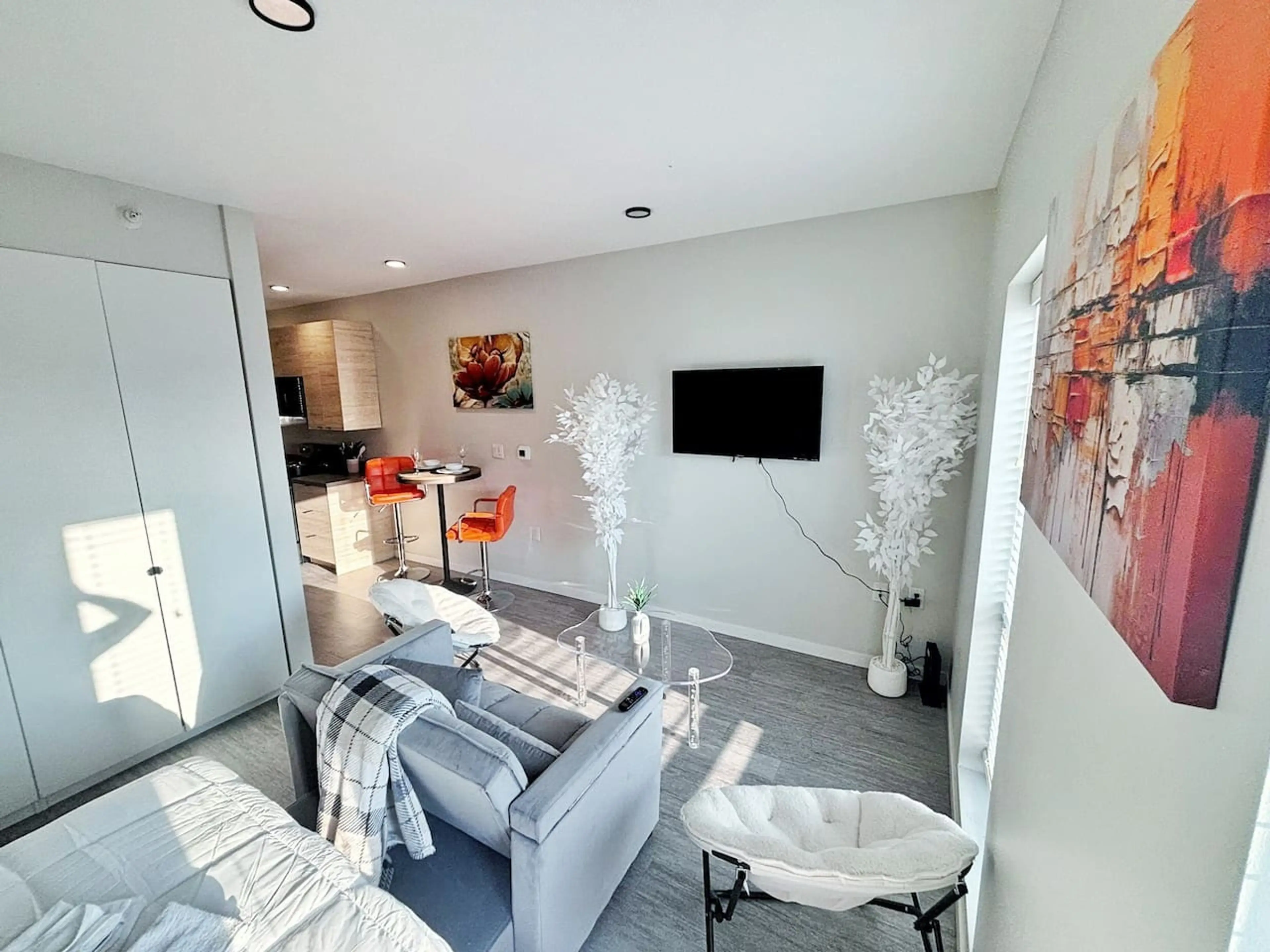 Welcome to Zesty Orange Abode! This vibrant studio features bold orange accents, including a striking bedframe and bar stools, set against a backdrop of sleek white, grey, and brown tones. Perfect for a lively and stylish stay, it’s located in downtown Des Moines, steps from the trendy East Village,...