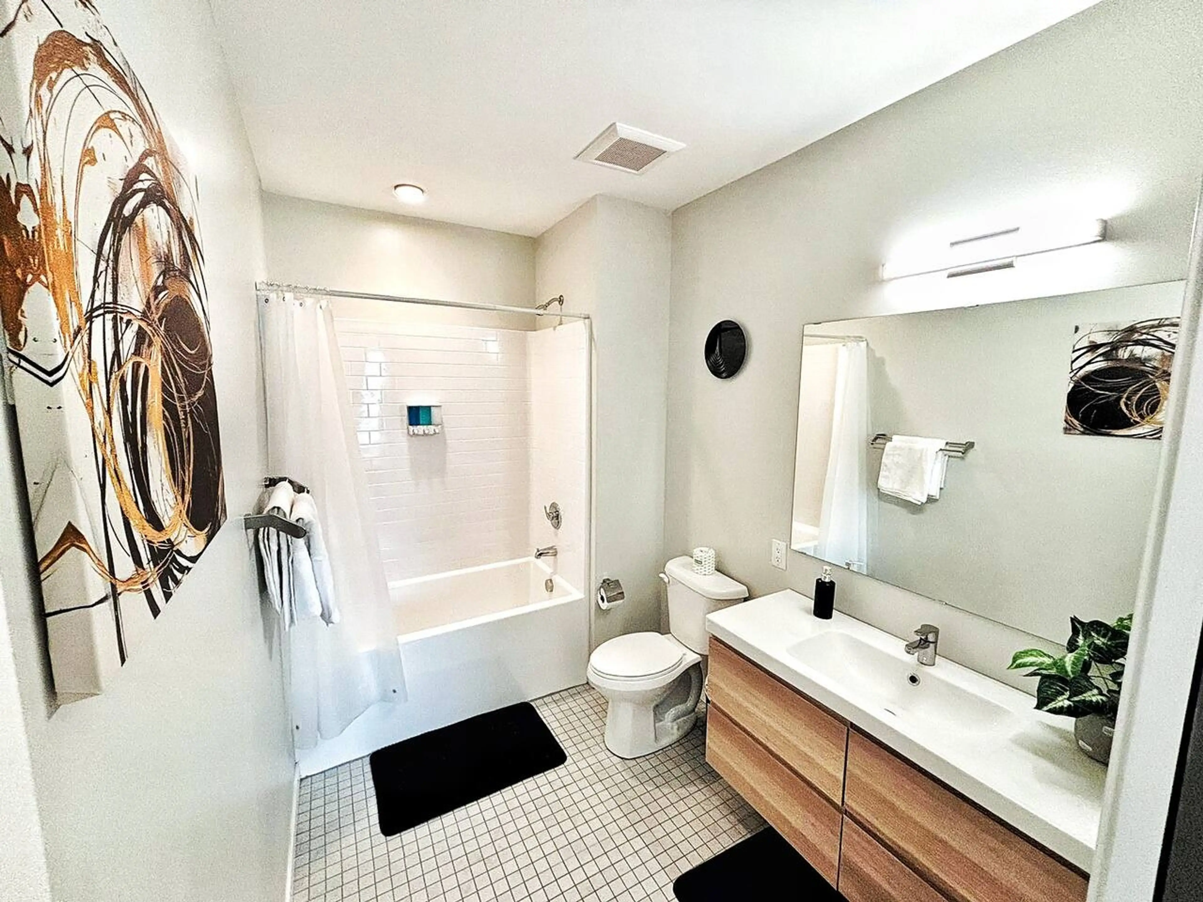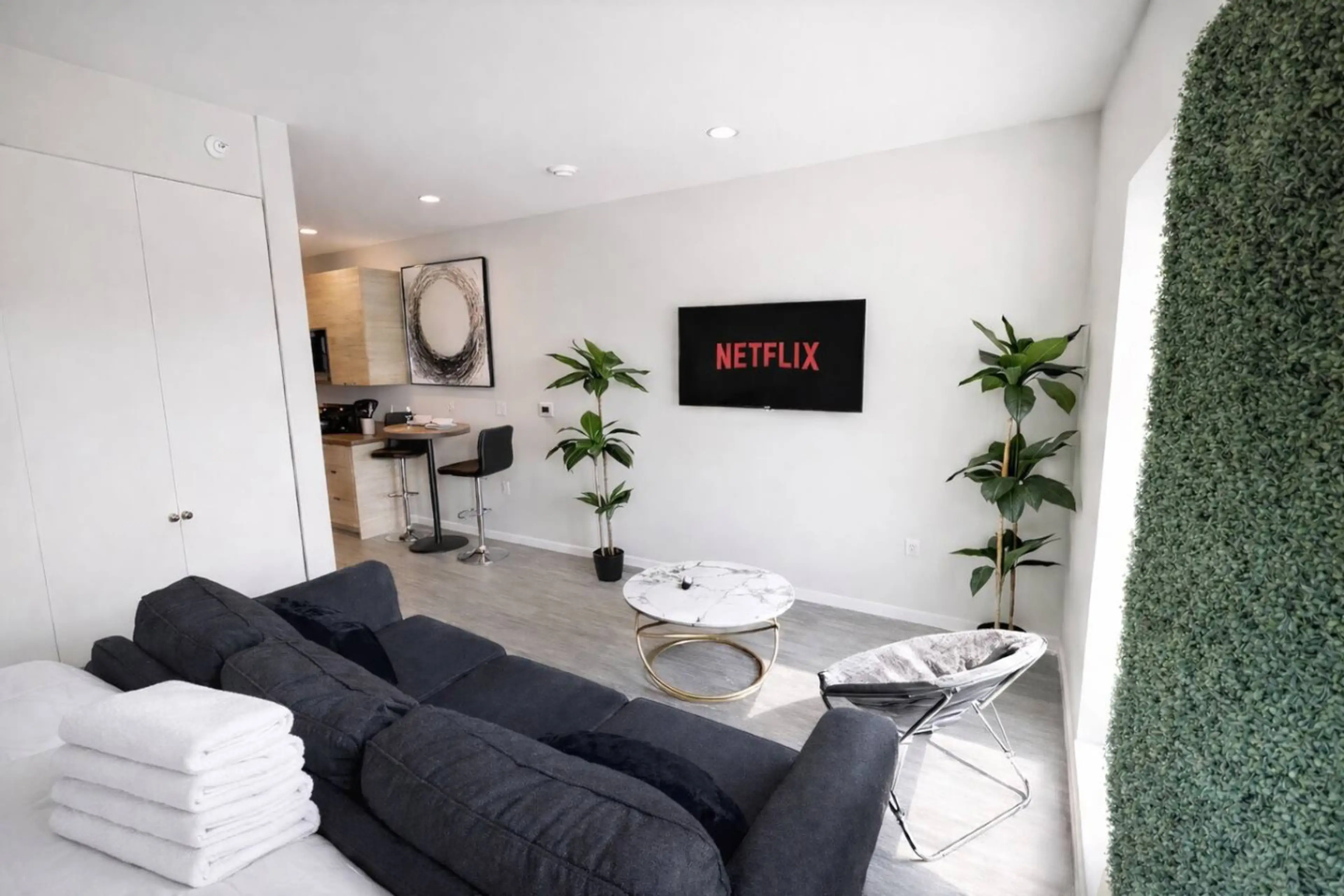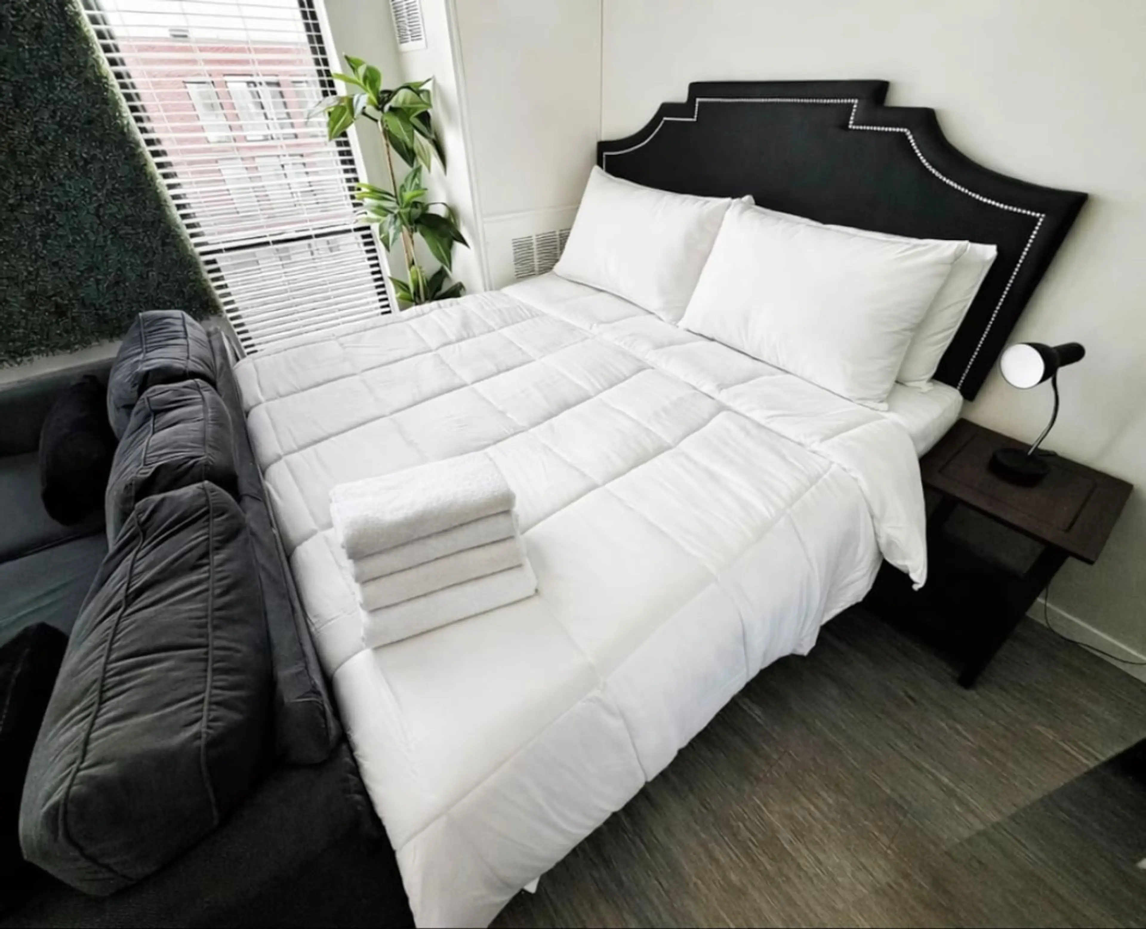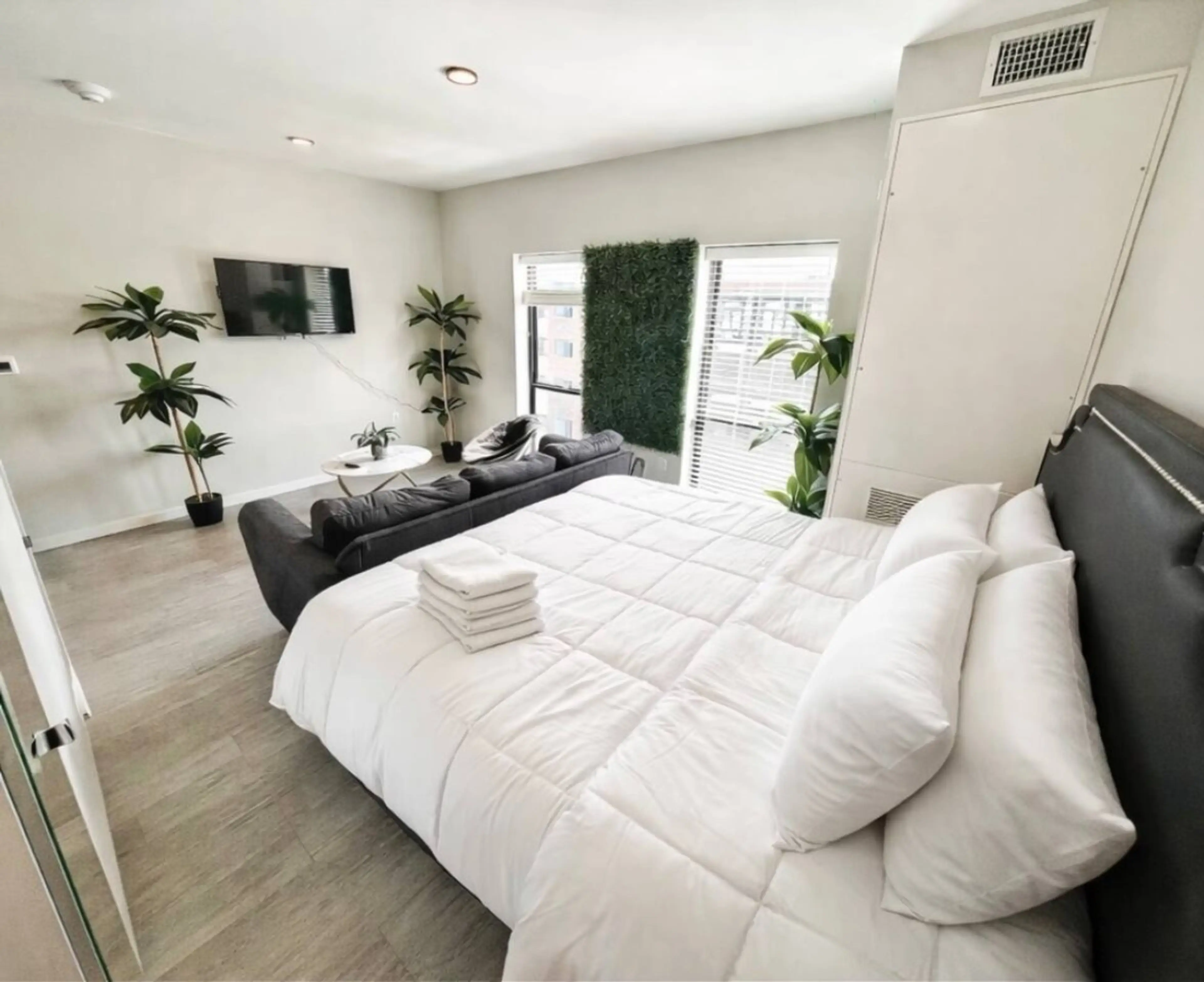 Welcome to the Urban Jungle Retreat! This stunning studio is a bold blend of sleek black interiors and lush greenery, featuring a striking grass wall that brings nature indoors. Relax in the comfort of a luxurious king-size bed in a modern, stylish space. Located in downtown Des Moines, you're just ...