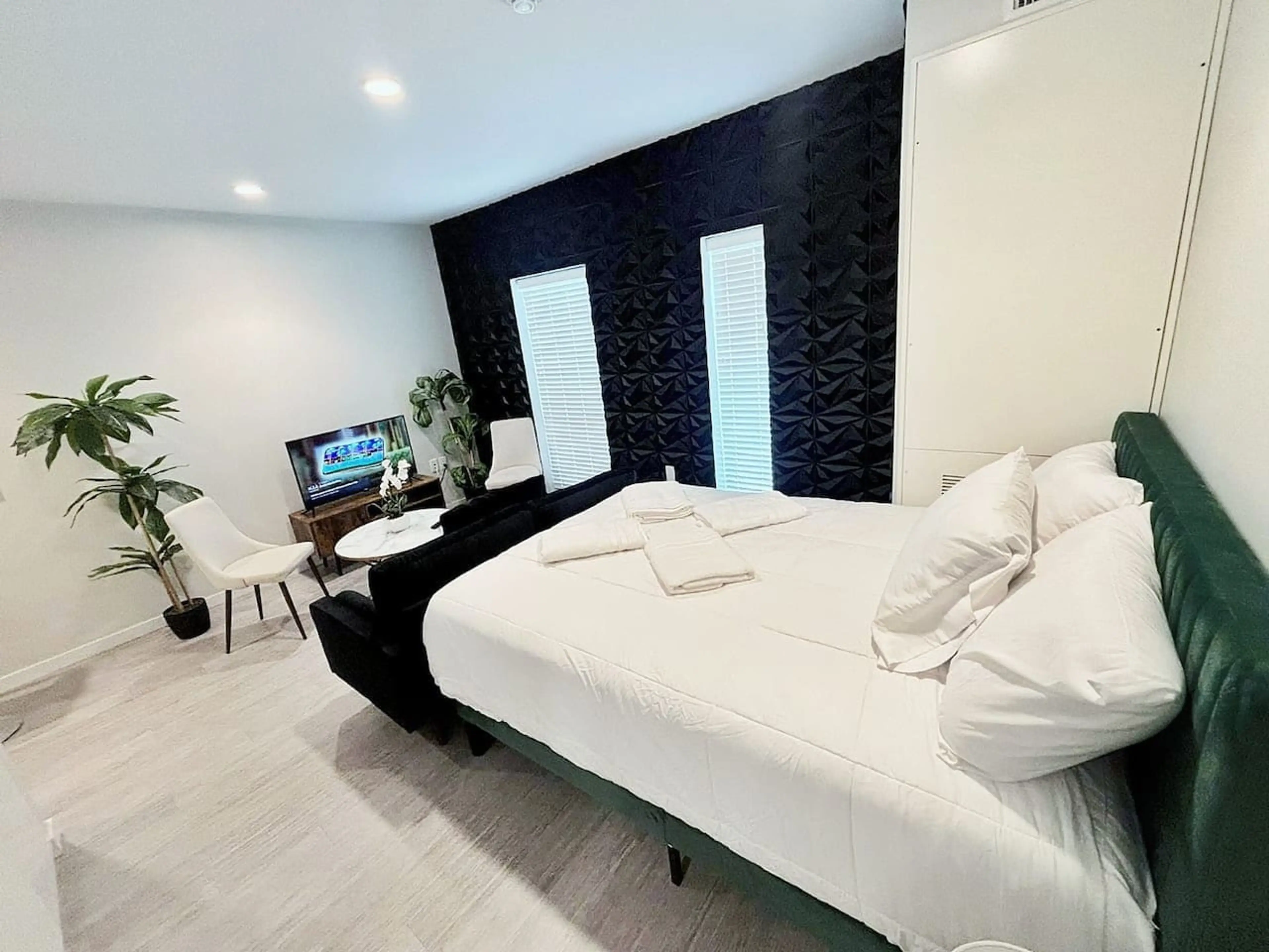 Inkstone Studio is a stylish retreat featuring a bold black accent wall, light tones, and a plush emerald-green bed. Cozy lighting, modern décor, and chic furnishings create a warm, inviting space. Located in Des Moines near popular attractions, it offers free Wi-Fi and convenient street parking for...